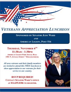 Sen. Judy will host a Veterans Appreciation Lunch on Thursday, Nov. 6 at the American Legion Park Social Hall at 1501 N. Juniata Street Hollidaysburg, PA, from 11:30am-1:30-pm. Area veterans and their families are invited to attend free of charge in appreciation of their service to our country. Attendees must register by calling (814) 695-8386.