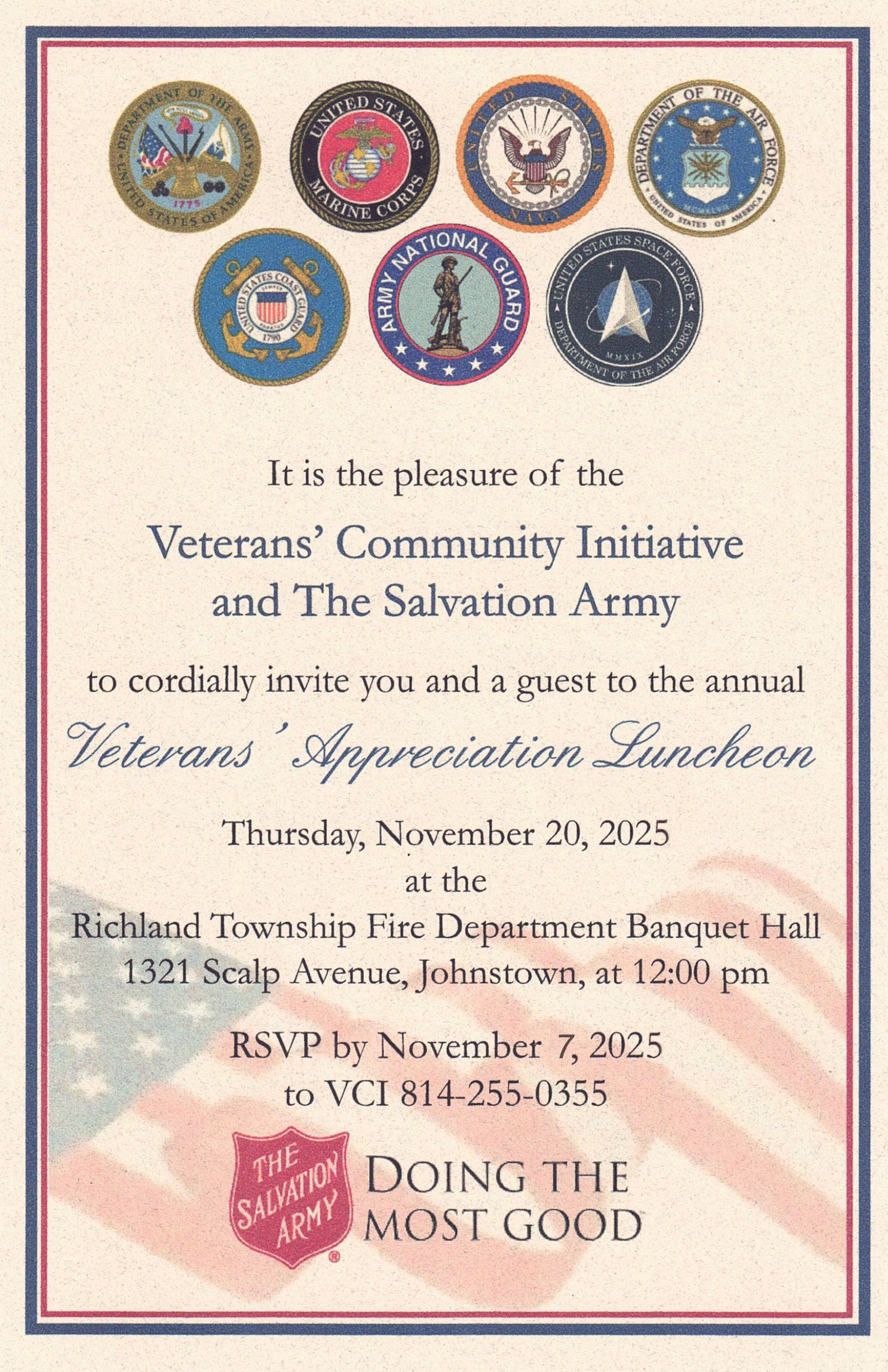It is the pleasure of Veteran Community Initiatives, Inc. (VCI) and the Salvation Army to cordially invite you and a guest to this year’s Veterans’ Appreciation Luncheon! This no-cost event is to honor the local Veteran community through a special recognition luncheon.